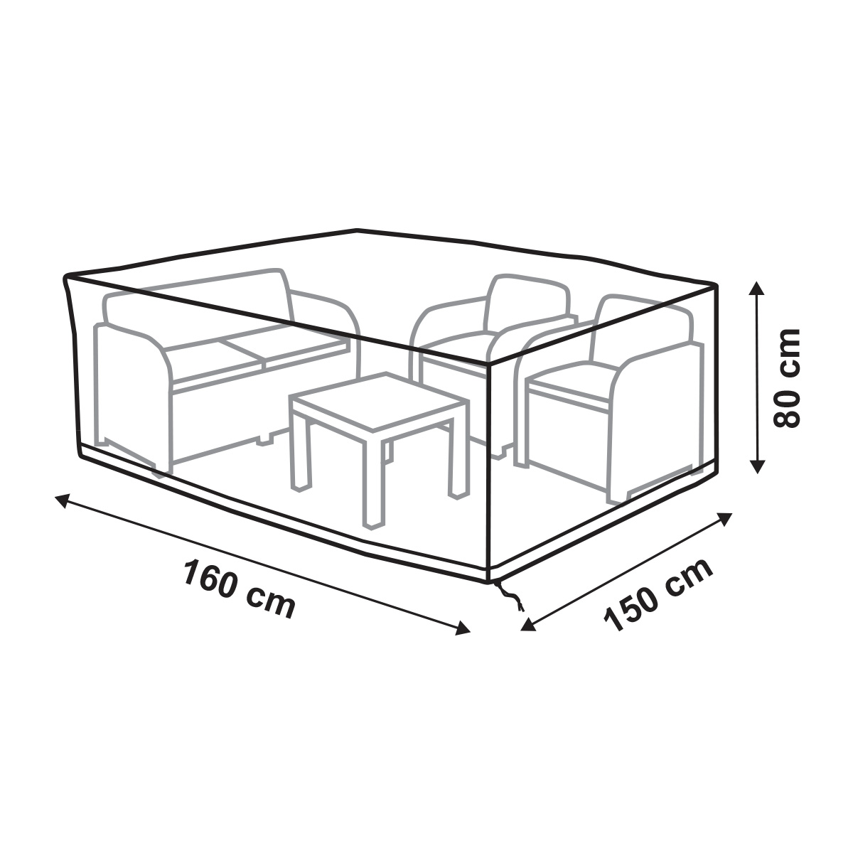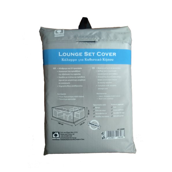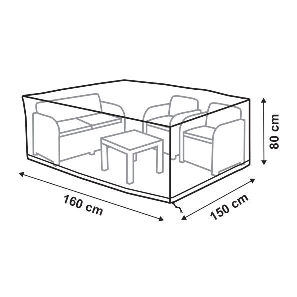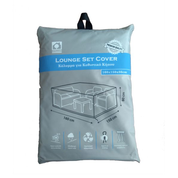 Υφασμάτινο κάλυμμα για καθιστικό κήπου, διάστασης 160x150x80εκ., σε χρώμα γκρι. Κατασκευασμένο από υψηλής αντοχής πολυεστέρα 420D ύφασμα Oxford, προστατεύει από σκόνη, βροχή κ.α. Διαθέτει 4 σχοινιά και 1 κορδόνι περίσφιξης στο κάτω μέρος για κατάλληλη εφαρμογή. Με προστασία UV. Διαθέτει αεραγωγούς που εμποδίζουν την εξάπλωση της υγρασίας. Εύκολο καθάρισμα. Το προϊόν διατίθεται σε εύχρηστη θήκη αποθήκευσης.