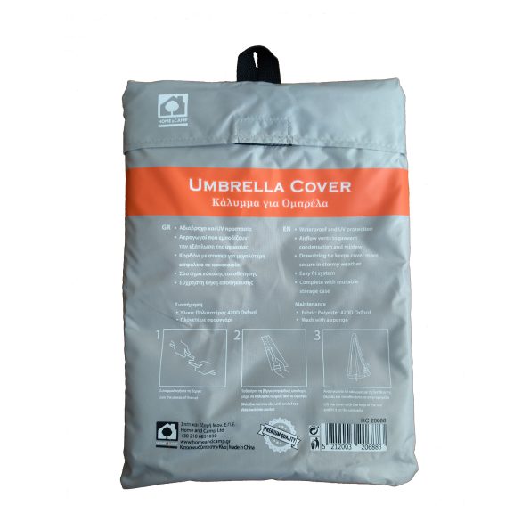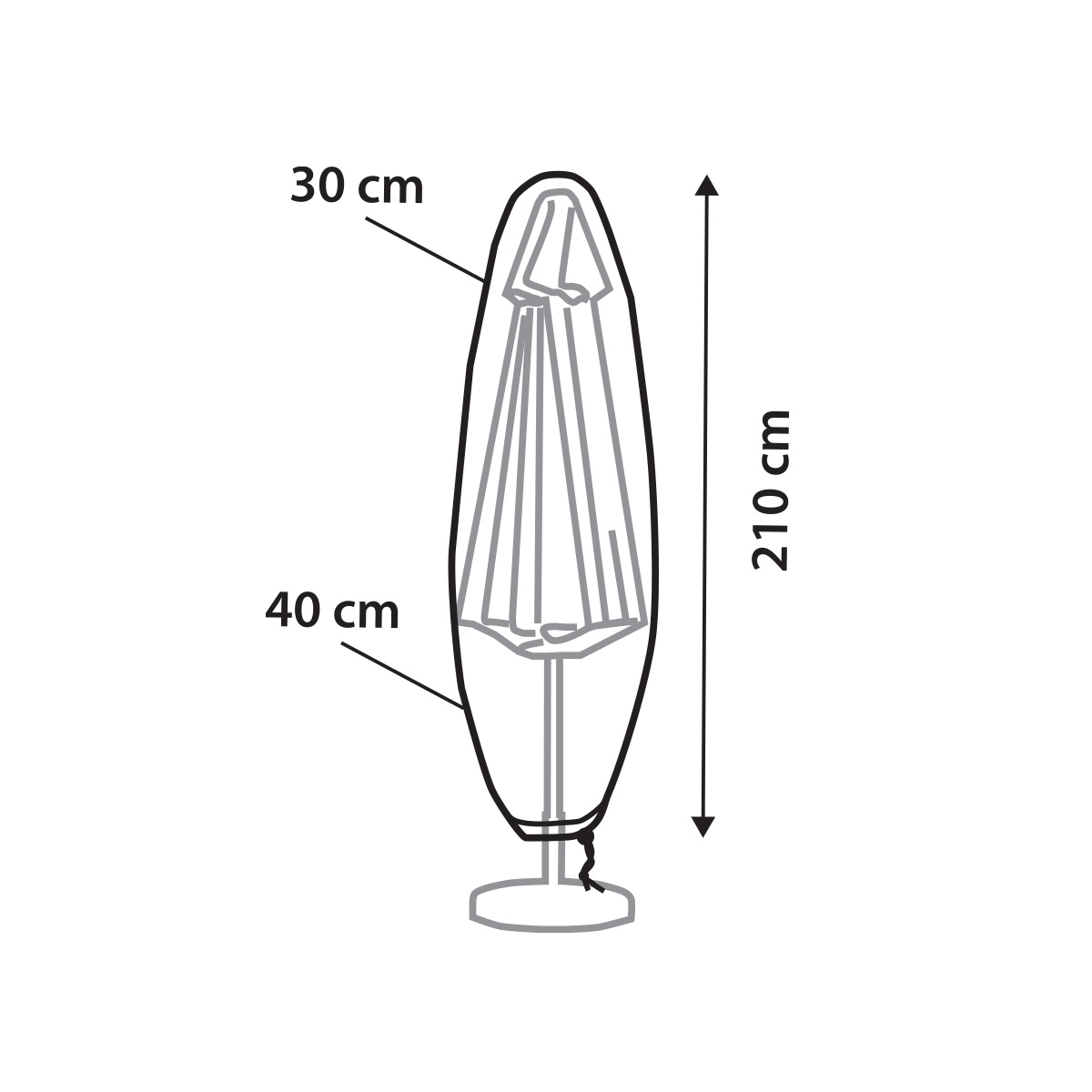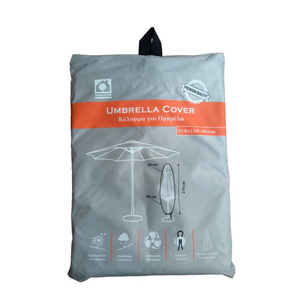 Υφασμάτινο κάλυμμα για ομπρέλα, διάστασης 210×30-40εκ., σε χρώμα γκρι. Κατασκευασμένο από υψηλής αντοχής πολυεστέρα 420D ύφασμα Oxford, προστατεύει από σκόνη, βροχή κ.α. Διαθέτει 4 σχοινιά και 1 κορδόνι περίσφιξης στο κάτω μέρος για κατάλληλη εφαρμογή. Με προστασία UV. Διαθέτει αεραγωγούς που εμποδίζουν την εξάπλωση της υγρασίας. Εύκολο καθάρισμα. Το προϊόν διατίθεται σε εύχρηστη θήκη αποθήκευσης.