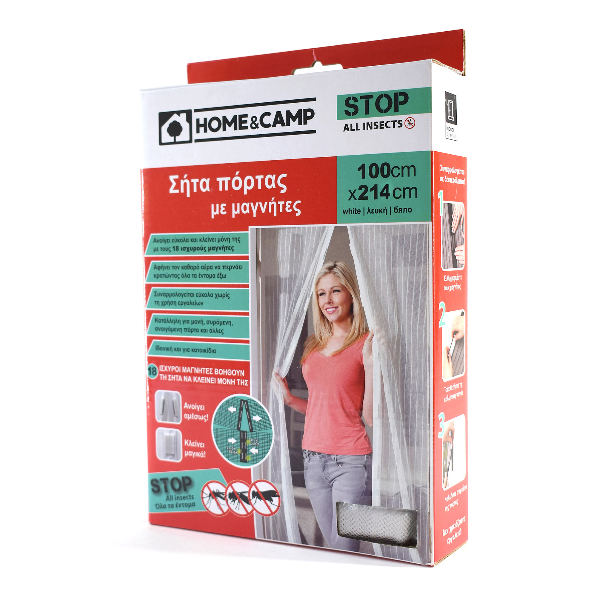 Σήτα πόρτας με μαγνήτες διάστασης 100×210εκ., σε λευκό χρώμα. Κατασκευασμένη από πολυεστέρα με 18 ισχυρούς μαγνήτες, 2 πάνελ σήτας, 12 κολλητικές ταινίες και 20 πινέζες. Χρησιμοποιείται στις εισόδους των σπιτιών για να αποτρέπει την εισχώρηση κουνουπιών και άλλων ενοχλητικών εντόμων, επιτρέποντας τη κυκλοφορία του αέρα. Εύκολη εγκατάσταση, δεν απαιτούνται ειδικά εργαλεία. Αποθηκεύεται εύκολα.