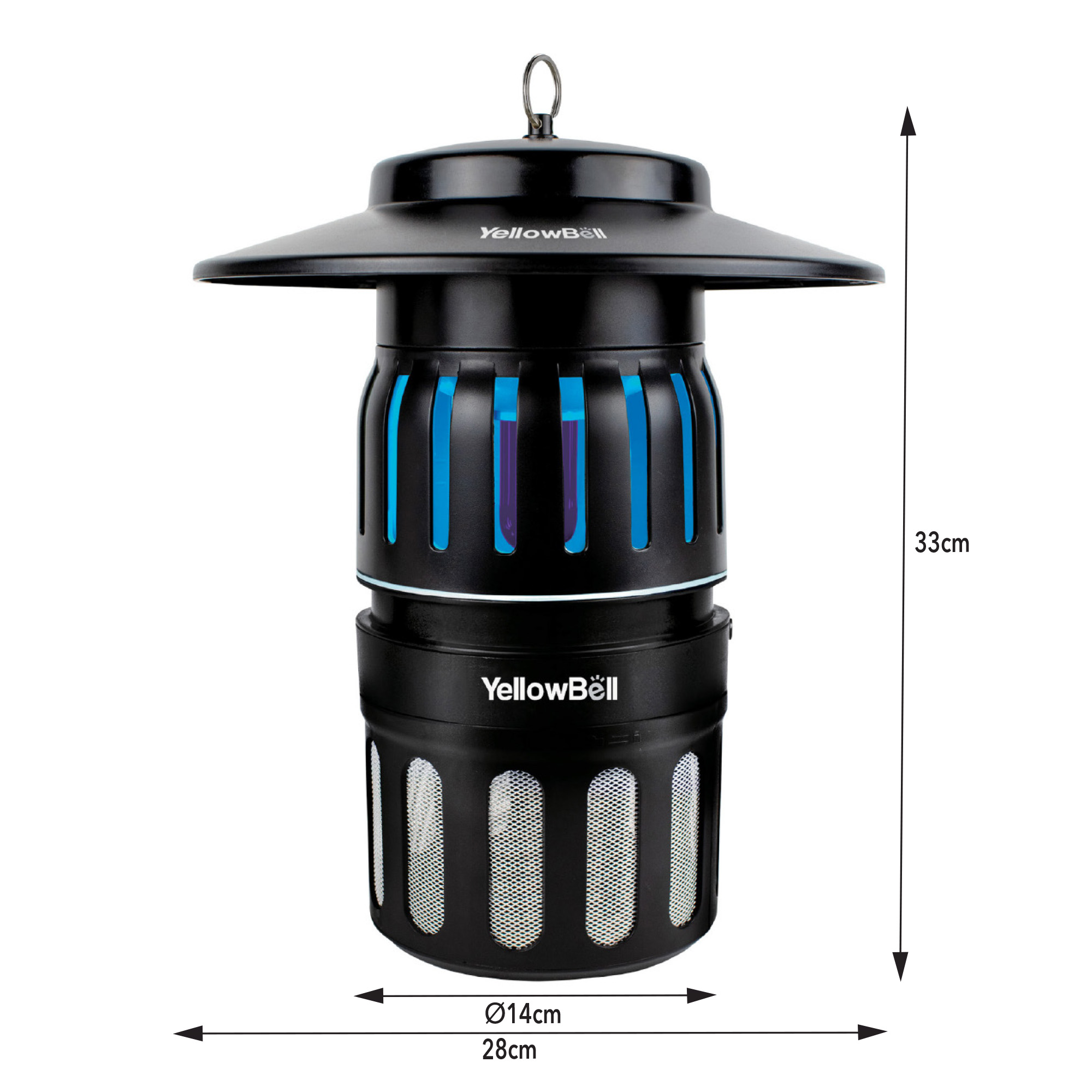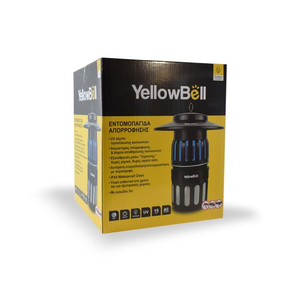 Εντομοπαγίδα απορρόφησης YellowBell, διάστασης 14x14x33cm σε μαύρο χρώμα. Με λάμπα UV η οποία μπορεί να παράξει φως 360-400nm που προσελκύει τα κουνούπια και τα εξολοθρεύει μέσω “ξήρανσης. Διαθέτει ανεμιστήρα απορρόφησης, δοχείο κατά της διαφυγής των κουνουπιών, αυτόματη ενεργοποίηση/απενεργοποίηση με περιστροφή, διακόπτη ON/OFF και καλώδιο μήκος 3m. Είναι κατασκευασμένη από ανθεκτικό υλικό στο χρόνο και στους εξωτερικούς χώρους, με IPX4 Waterproof Class. Χωρίς χημικά, χωρίς υψηλή τάση, φιλική προς το περιβάλλον-μη επιβλαβές για τον άνθρωπο. Για εξωτερική χρήση.
